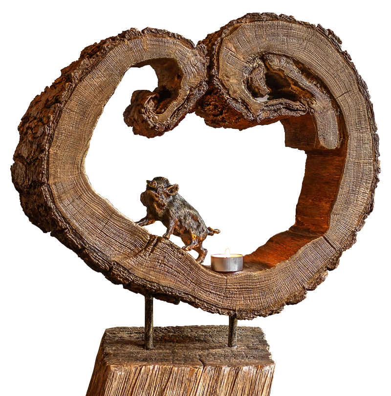 Арт-произведение выполнено из выветренного ствола древнего дуба. Фактурная поверхность обработана воском и позолотой. Подставка выполнена из лиственницы. Внутри находится бронзовая фигурка кабана и свеча. ⠀